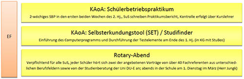Nach der Potenzialanalyse in Jg. 8 stehen für die Schülerinnen und Schüler des neunten Jahrgangs im Rahmen der Studien- und Berufsorientierung die sogenannten Berufsfelderkundungstage (kurz: BFE) an. Einen dieser drei Tage absolviert die gesamte Stufe zusammen in Form des Besuches der Ausbildungsmesse Berufe live in Köln im November.