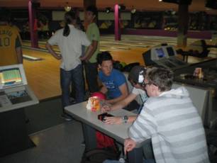 Zu Hause angekommen war nur wenig Zeit zum Verschnaufen, wir waren nämlich noch allesamt zum Bowling in Poznan verabredet. Eigentlich hatte Mama Syzmczak noch Mittagessen geplant, Hähnchen, jedoch war dafür nicht mehr genug Zeit. Wir packten schnell unsere Sachen und machten uns auf den Weg zum Bahnhof, wo wir viele der anderen Leute trafen, alle im Begriff, Zugtickets zu kaufen. Wir gesellten uns dazu und redeten ein bisschen, bis wir uns gemeinsam auf dem Weg zum Bahnsteig machten, um nach Poznan zu fahren... die Fahrt war zwar nicht allzu lang, jedoch ein wenig unkomfortabel, da recht voll. Nach der Ankunft war noch ein wenig Wartezeit abzusitzen, denn zur Abwechslung fuhren wir nicht mit der Straßenbahn oder gingen zu Fuß, sondern fuhren mit dem Bus zur Bowlingbahn. Dort angekommen wurden nach ein paar Formalitäten die Bahnen zugeteilt und dann konnten die Spiele beginnen. Filip, Kevin, Piotr, Martin, Philipp, Maciej und Patryk waren mit mir auf einer Bahn. Entgegen aller anfänglichen Erwartungen gewann Kevin unsere Runde, ich wurde zweiter, jedoch war meine Konzentration stark geschwächt, da ich wie ein paar andere Leute dem Glücksspiel verfallen war. Während ein paar Leute wie Marcin oder Wojciech versuchten, den einarmigen Banditen zu plündern, scheiterte ich hoffnungslos daran, einen iPod zu gewinnen, bekam lediglich zwei Schlüsselanhänger. Eine erhebliche Menge meines polnischen Geldes hat mich das gekostet, aber es hat nichtsdestotrotz Spaß gemacht, sowohl das Bowling als auch das Spielen.