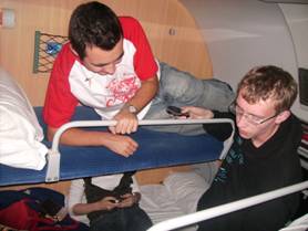 Um 21.45Uhr war es dann auch endlich so weit und es hieß Abschied nehmen von Eltern, Geschwistern und Freunden. Nachdem uns unsere Abteile zugeteilt worden waren und wir den Zug betraten, waren wir zunächst etwas geschockt, als wir unsere „Zimmer“ sahen. Doch auch wenn die Abteile nicht sehr geräumig waren schafften wir es dennoch, unsere Koffer zu verstauen. Dass man dort nicht viel mehr als liegen konnte, hatte auch seine Vorteile, doch an Schlaf war in den ersten Stunden nicht zu denken. Die Müdigkeit überkam uns dann später aber doch und so verschliefen einige von uns sogar den 30minütigen Aufenthalt in Hannover. Erst kurz bevor wir in Poznan umsteigen sollten, wurden wir wieder wach und fuhren dann von dort aus nur noch 50 Minuten bis zu unserm eigentlichen Ziel: